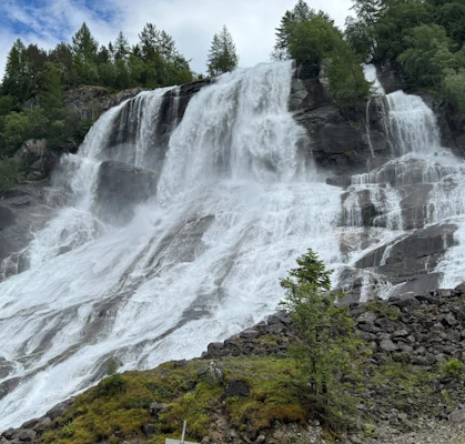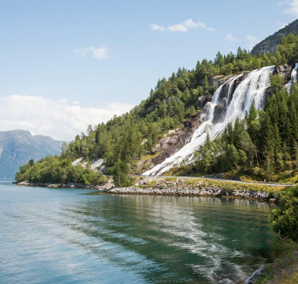 Located near Norheimsund in the Hardanger region, Steinsdalsfossen is one of Norway’s most well-known and accessible waterfalls. The surrounding area is known for its fertile landscapes and scenic roads, making this a pleasant stop along the journey.