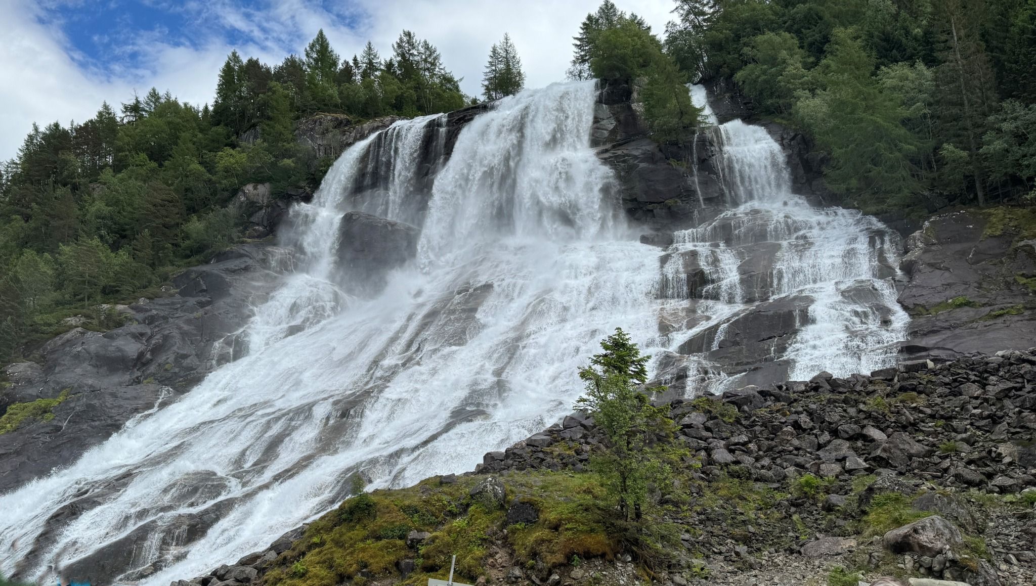 Located near Norheimsund in the Hardanger region, Steinsdalsfossen is one of Norway’s most well-known and accessible waterfalls. The surrounding area is known for its fertile landscapes and scenic roads, making this a pleasant stop along the journey.