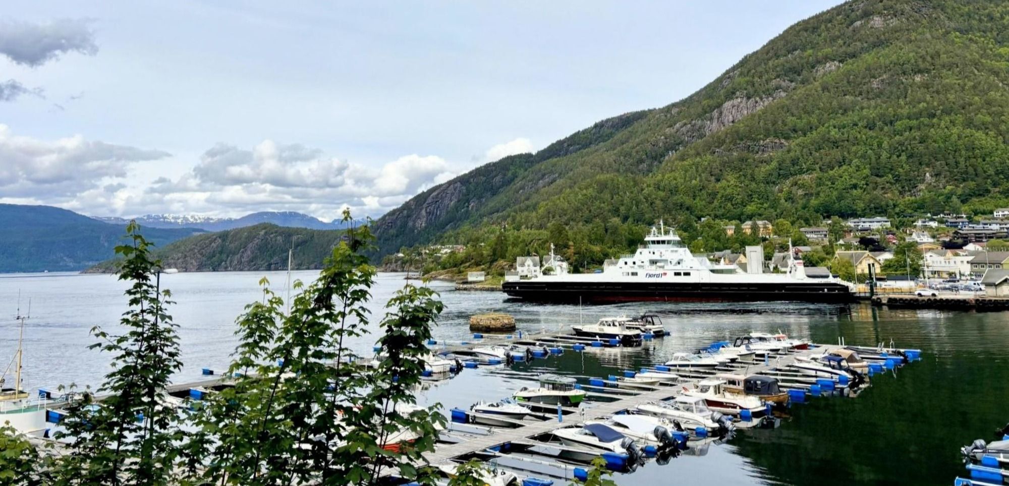 About 40 minutes after leaving Blåbærsletta, we arrive at Gjermundshamn, where we take our first ferry crossing of the day across the Hardangerfjord. The short journey of around 20 minutes offers beautiful views of the fjord and the surrounding mountains and provides a pleasant break from the road. As we sail across the fjord, you can enjoy the changing scenery and see the landscape from a different perspective.
