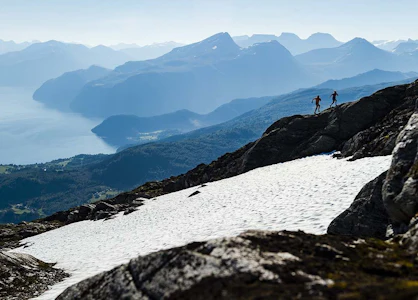 From here, we ride the Stranda Gondola to the summit of Roaldshornet, 1,230 metres above sea level. The gondola offers breathtaking alpine views as we rise from the fjord to the high mountains. At the top, a truly unforgettable panoramic view awaits – overlooking Storfjorden, the village of Stranda, and the dramatic Sunnmøre Alps, with their steep peaks, deep valleys, and snow-capped summits. On clear days, you can even see all the way to the ocean in the west and the mountain ranges surrounding Geiranger to the east.