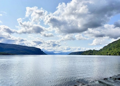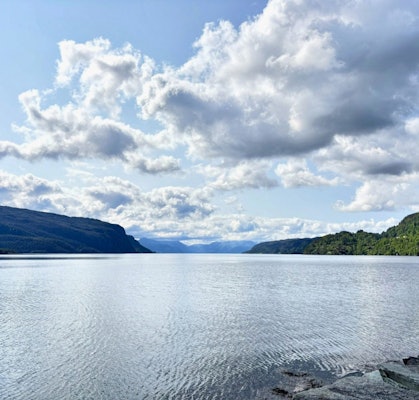 Here, the fjord stretches wide between towering mountains and shimmering blue waters, offering one of the most breathtaking panoramas along the route.