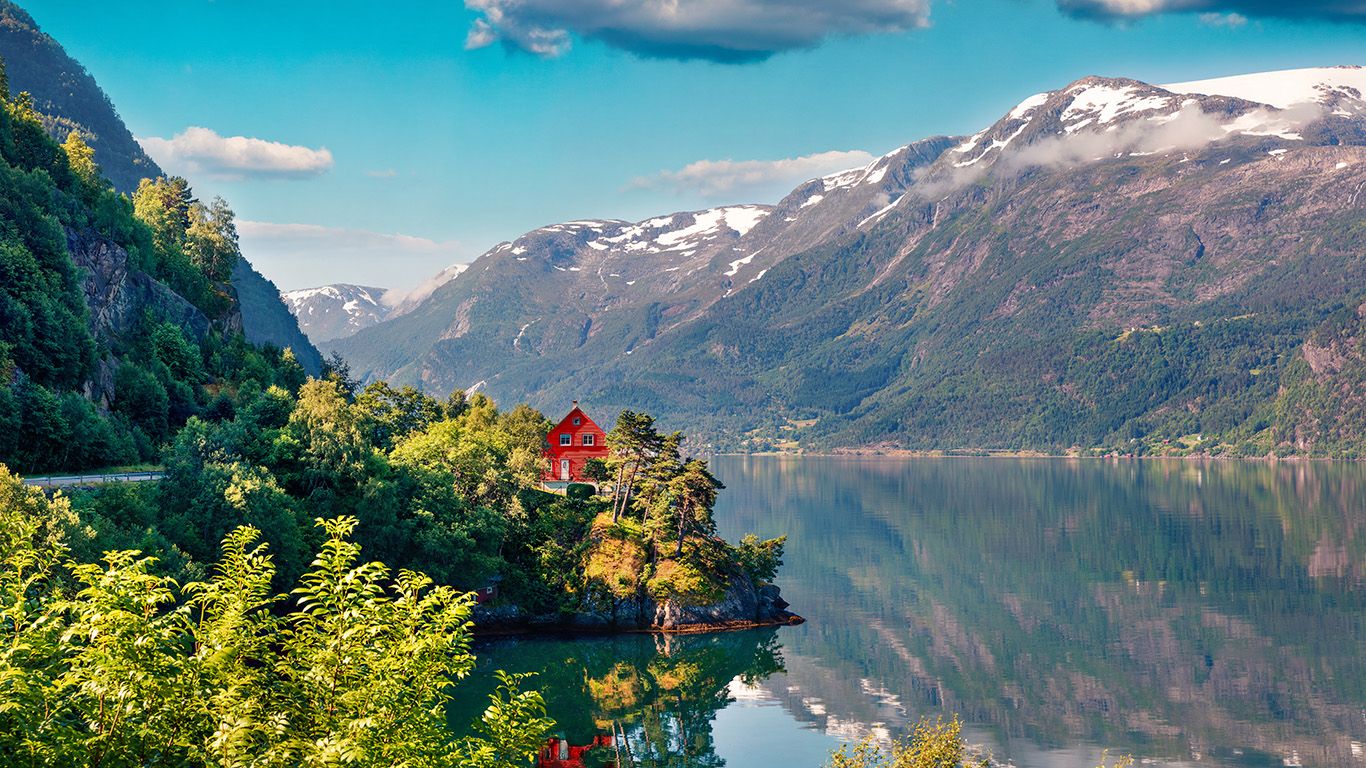 Within a couple of minutes after leaving the city center, we pass through the southern suburbs of Bergen, driving through impressive mountain tunnels before the cityscape gives way to peaceful countryside and fjord views.