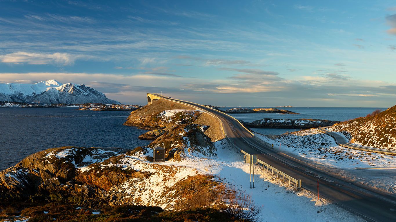 Atlanterhavsveien – En av verdens vakreste kystveier, der vi kjører over broer som bukter seg gjennom det ville havlandskapet.