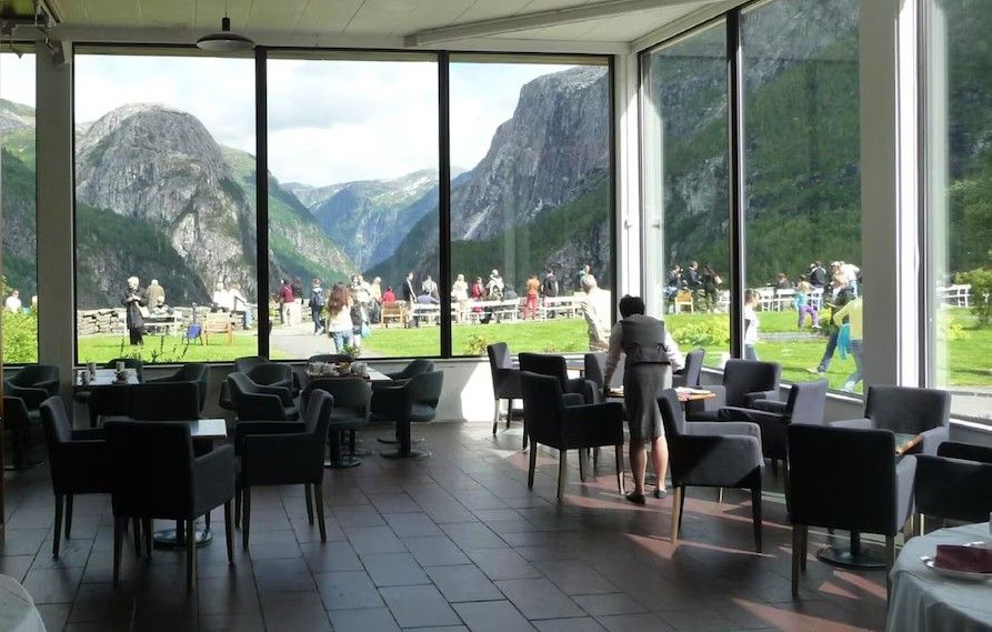 Vi stopper også ved det historiske Stalheim Hotel, vakkert plassert med utsikt over Nærøydalen, der du får servert kaffe og nystekte vafler – med en av Norges mest fantastiske utsikter.