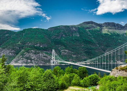 På det smaleste punktet av fjorden kan du se den elegante hengebroen som forbinder Osterøy med fastlandet.