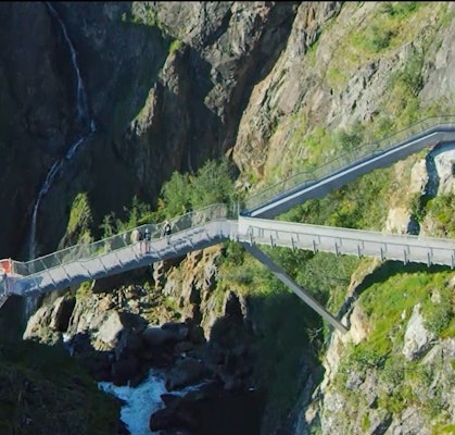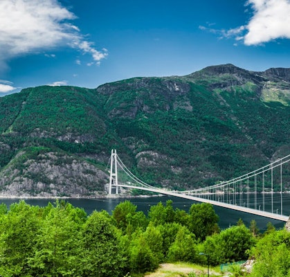 Turen fortsetter til Hardangerbroen, en av verdens lengste hengebroer og et imponerende ingeniørarbeid.