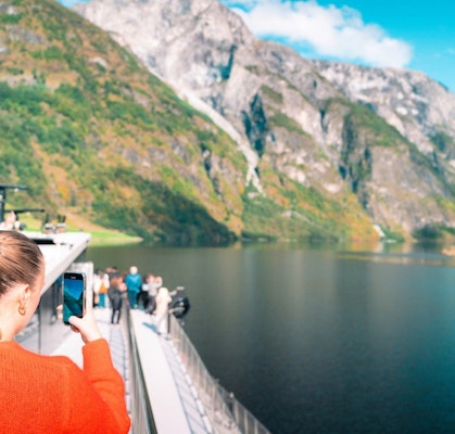 In Gudvangen, we board the boat that takes us onto the Nærøyfjord – one of Norway’s most beautiful and dramatic fjords.