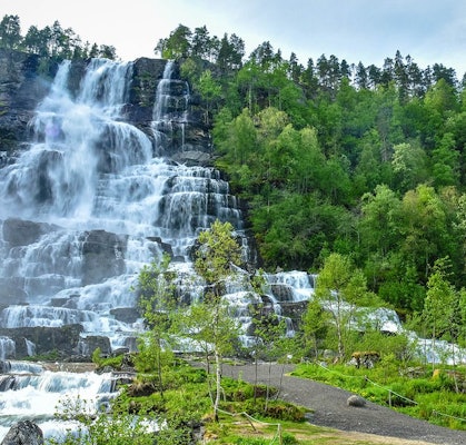 Tvindefossen is an impressive waterfall, dropping 116 meters in a beautiful display of multiple streams cascading down the cliff.